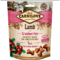 Carnilove Dog Crunchy Snack Lamb with Cranberries with fresh meat 200 g. Složení: 50% (sušené jehněčí 35 %, čerstvé jehněčí 15 %), dýně 15 %, žlutý hrách 8 %, sušené jablko 5 %, mrkev 5 %, cizrna 4 %, brusinky 4 %, kuřecí tuk (konzervovaný tokoferoly) 4 %, lněné semínko 2 %, sušený špenát, 2 %, lněný olej 1 %.