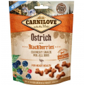 Carnilove Dog Crunchy Snack Ostrich with Blackberries with fresh meat 200 g. Složení: pštros 50 % (sušený pštros 35 %, čerstvý pštros 15 %), dýně 15 %, žlutý hrách 8 %, sušené jablko 5 %, mrkev 5 %, cizrna 4 %, ostružiny 4 %, kuřecí tuk (konzervovaný tokoferoly) 4 %, lněné semínko 2 %, sušený špenát 2 %, lněný olej 1 %.